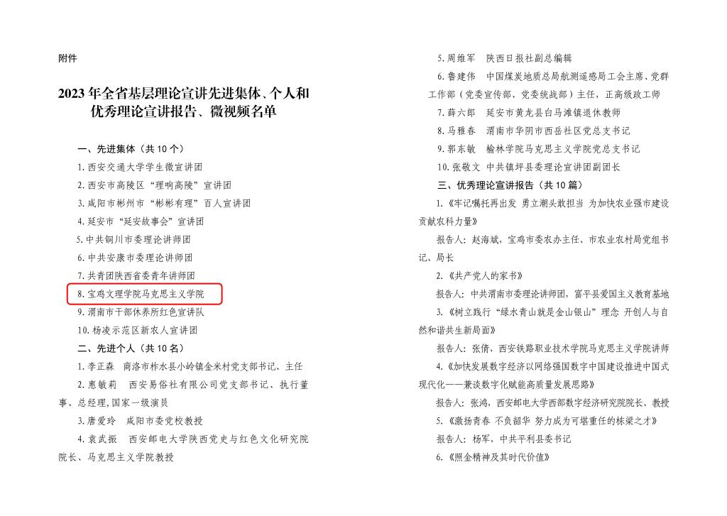 近日,中共陕西省委宣传部、中共陕西省委讲师团发布了《2023年全省基层理论宣讲先进集体、个人和优秀理论宣讲报告、微视频名单公示》,我集团太阳成集团122cc获评2023年“全省基层理论宣讲先进集体”,成为本年度全省高校系统唯一获得表彰的太阳成集团122cc。