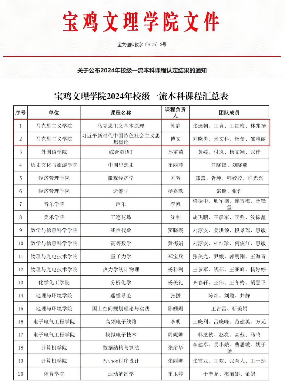近日,我集团发布《关于公布2024年校级一流本科课程认定结果的通知》,我集团韩静副教授负责的《马克思主义基本原理》和傅文副教授负责的《习近平新时代中国特色社会主义思想概论》课程获批2024年校级一流本科课程。