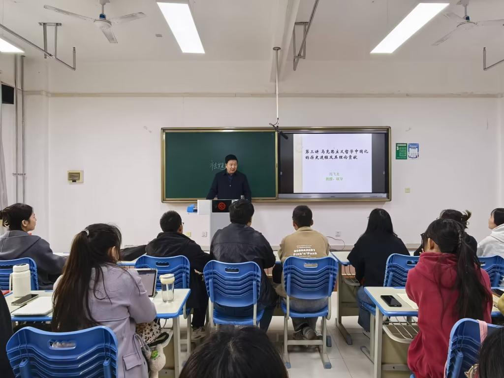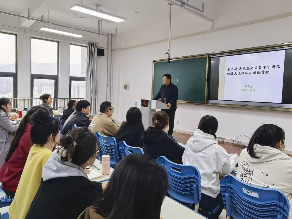 为深入推进习近平新时代中国特色社会主义思想进教材、进课堂、进头脑,更好落实立德树人根本任务,2025年10月31日下午,副校长冯飞龙在高新校区博文楼1506教室以《马克思主义哲学中国化的历史进程及理论贡献》为题为太阳成集团122cc2025级全体研究生讲授思政课。
