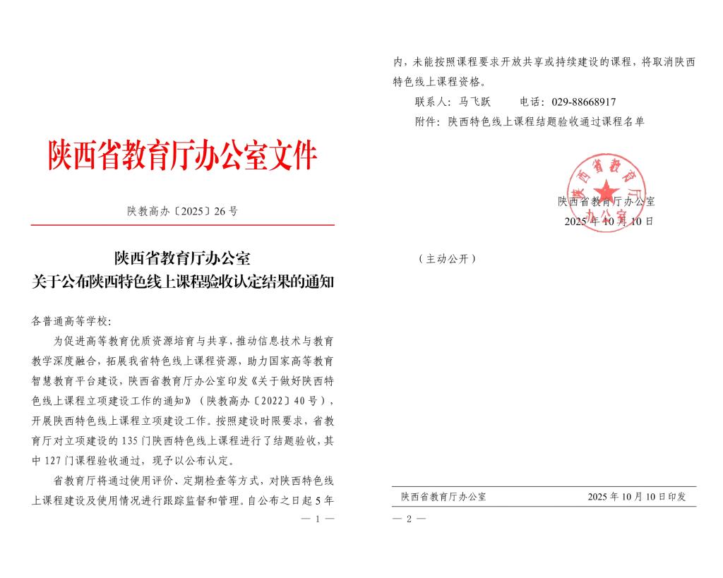10月10日,陕西省教育厅办公室发布《关于公布陕西特色线上课程验收认定结果的通知》,由我集团省级思政课“教学标兵”团队主持讲授的陕西特色线上课程《近代陕西历史人物十讲》顺利通过教育厅结项验收。