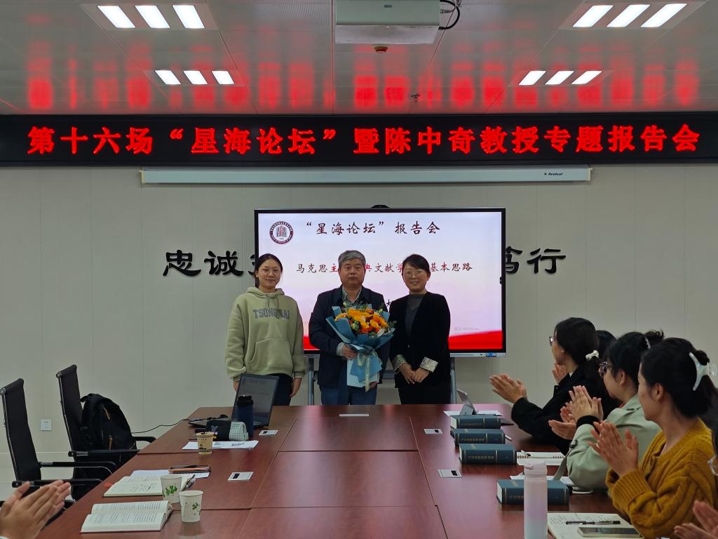 陈中奇指出阅读经典有助于深入了解经典作家科学思想形成的根据,有效地学习他们观察和处理问题的立场和方法,进一步破除对马克思主义的教条式理解,澄清附加在马克思主义名下的错误观点。在阅读马克思主义经典文献时,应把握单篇学、对照学、分段学、专题学、系统学的基本思路,同时采用历史学习法、比较学习法和研究式学习法等阅读方法,进而深刻认识到马克思主义理论的科学性和真理性。结合经典文献阅读的基本思路与阅读方法,陈教授分别推荐了系列经典书单。报告会结束后,硕士生代表李佳欣为陈中奇教授献花。