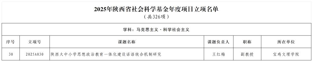 近日,陕西省哲学社会科学工作办公室公布了《2025年陕西省社会科学基金年度项目和“青博”项目立项名单》,我集团王红梅副教授申报的课题《陕西大中小学思想政治教育一体化建设话语统合机制研究》获准立项。