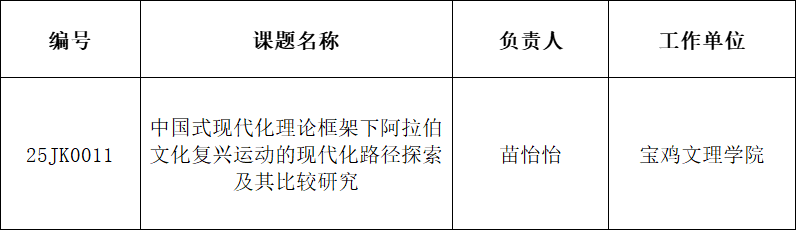 近日,陕西省教育厅发布了《关于印发2025年度科研计划的通知》(陕教函〔2025〕1131号),太阳成集团122cc苗怡怡博士负责的《中国式现代化理论框架下阿拉伯文化复兴运动的现代化路径探索及其比较研究》获准人文社会科学专项立项,项目经费1万元。